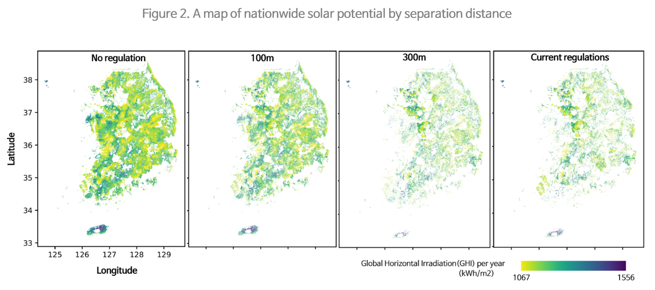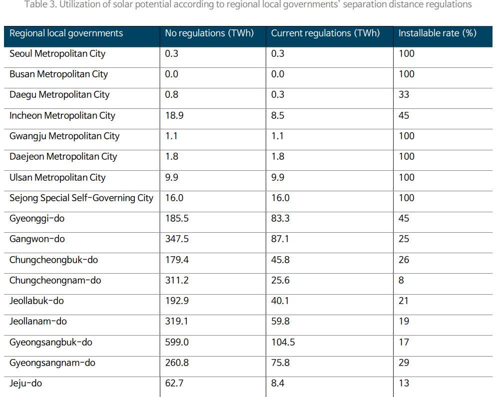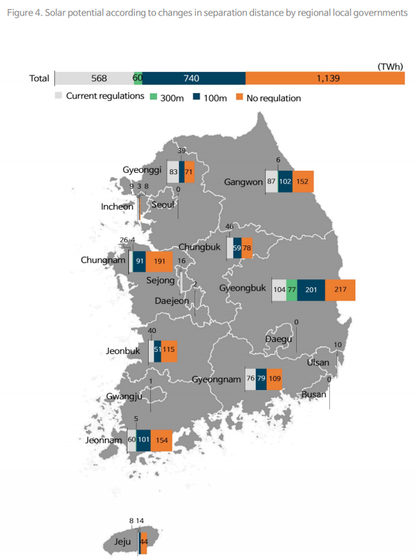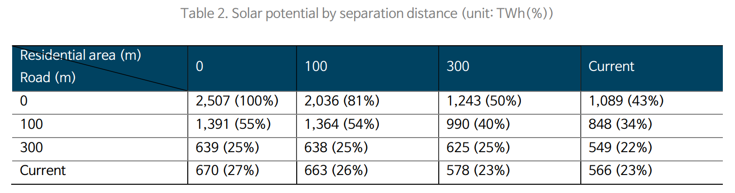 In the analysis of photovoltaic power potential according to current separation distance regulations in South Korea, it was determined that 1) only 22% of solar potential may be utilized compared to the baseline case of no regulation and 2) in securing solar potential, separation distance regulation is a more significant constraint for roads than for residential areas. Furthermore, because industry location, power plant site possession level, and urban density vary by region, it is necessary to design detailed policies suitable for each region.