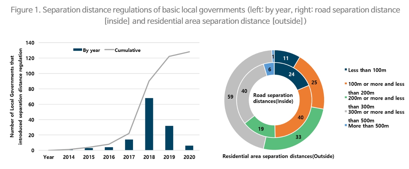 • Despite the Ministry of Trade, Industry and Energy’s announcement of Guidelines for Location of Solar Power Generation Facilities, 57% of all basic local governments have introduced separation distance regulations, and 83% of them have set a separation distance exceeding 100 m.