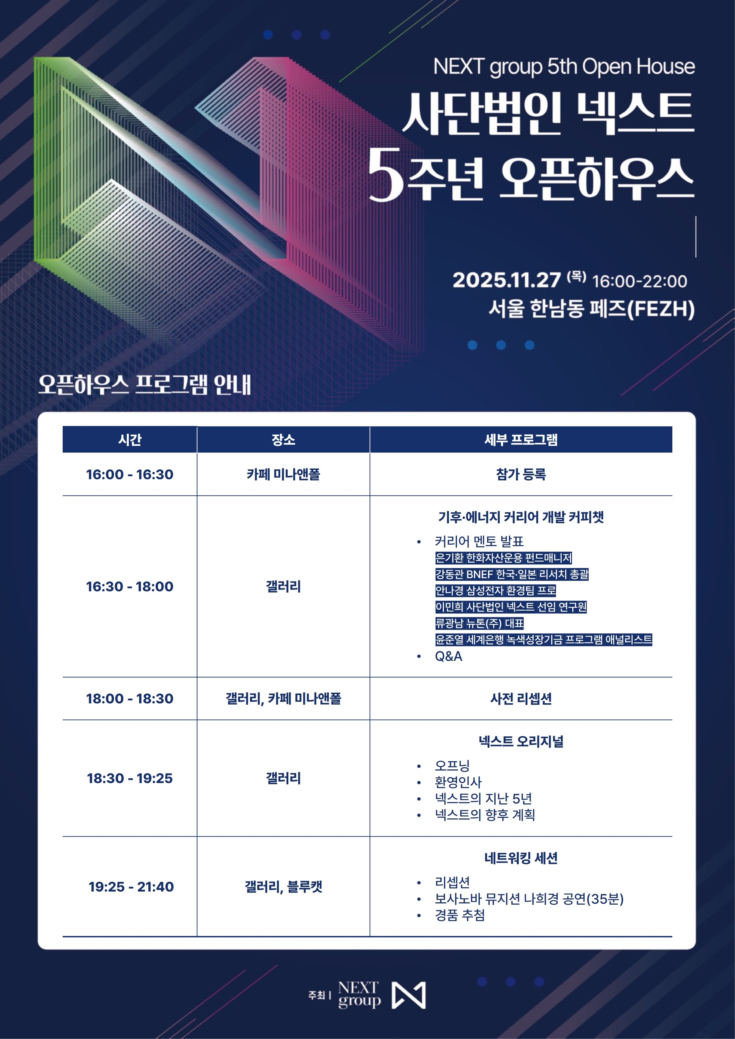 아시아 기후·에너지 정책 싱크탱크, 사단법인 넥스트가 창립 5주년을 맞았습니다. 그간의 성과와 미래 비전을 공유하고, 같은 비전을 가진 기후·에너지 분야 리더들과 교류하는 자리에 여러분을 초대합니다.