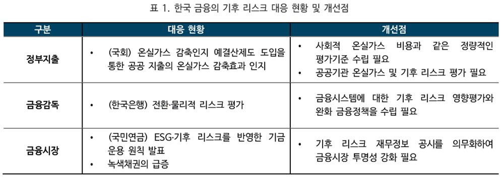 • 한국은 녹색채권 발행 증가, 국민연금의 ESG 투자원칙 발표, 정부지출의 온실가스감축 영향평가 등의 움직임은 있으나 기후 리스크 평가 방법론과 기준, 금융시장 참여 주체의 기후 리스크 공시의무 등 근본적 준비가 미흡한 상황으로 우리나라의 금융시스템이 기후 리스크 요소가 반영된 글로벌 금융시스템에 긴밀하게 대응하고 공통된 가이드라인과 투명한 정보에 의거하여 움직일 수 있도록 정부의 역할이 필요